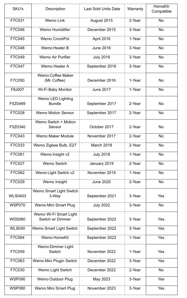 Belkin annonce que le 31 janvier 2026, tous les services et matériels Wemo seront coupés et ne seront plus supportés. Cela signifie que l'application, les accès distants, l'assistant vocale, etc. ne pourront plus fonctionner au-delà de cette date. Les matériels fonctionneront mais sans tous ces services distants (les services cloud Wemo). Seuls les Wemo connectés à HomeKit d'Apple pourront fonctionner au-delà de cette date. Les modèles WLS0503, WSC010, WSP100, WDC010 continueront à fonctionner.