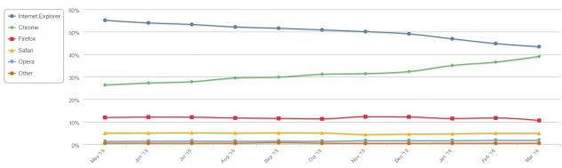Internet Explorer est en baisse constante depuis longtemps, et cette baisse s'accentue avec l'avènement de Windows 10 ce qui est normal, puisqu'Internet Explorer n'y est plus le navigateur officiel.