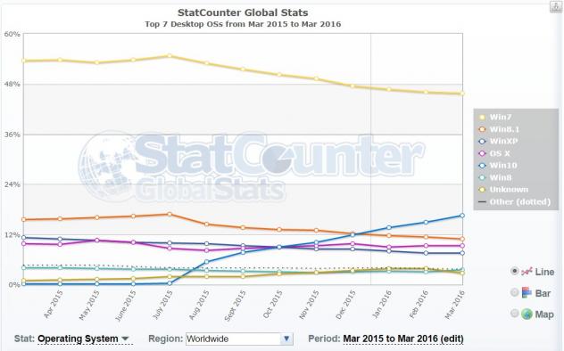 Les organismes qui tiennent des statistiques confirment les affirmations de Microsoft. StatsCounter dans ses statistiques mensuelles, indique que Windows 10 approche les 17% de parts de marché au niveau mondial. 16,53% exactement. Ce qui représente une belle progression sur le mois précédent qui donnait 14,86% de parts de marché à Windows 10.