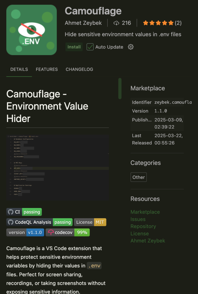 "Camouflage est une extension VS Code qui aide à protéger les variables sensibles en les cachant. C'est parfait en partage d'écran, en enregistrement." explique le créateur Ahmet Zeybek.
