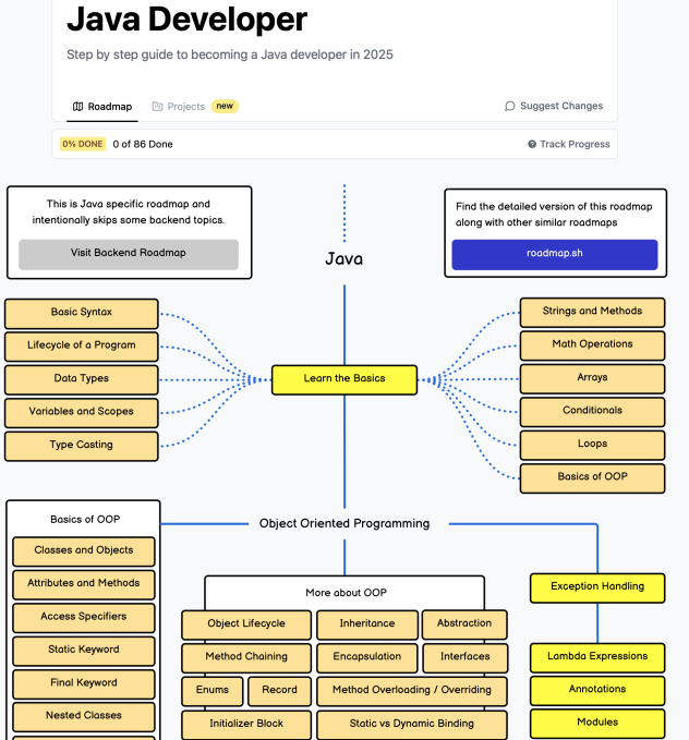 Il n'est pas toujours simple de savoir comment monter en compétence sur une technologie, nouvelle ou non. Pour vous aider à vous organiser et savoir comment s'y prendre et quoi apprendre, developer-roadmap propose une série roadmaps sur des technologies, des langages, des OS. Ces roadmaps sont des organigrammes très détailées sur les modules, les fonctionnalités, ce qu'il faut voir apprendre, les options, etc.