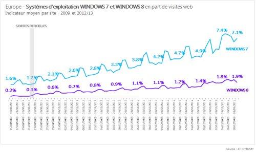 - Le 2 novembre 2012, une semaine après son lancement, Windows 8 affichait une part de visites de 0,6% en Europe. Deux mois plus tard, il atteint 1,9%, soit une hausse de 1,3 point.