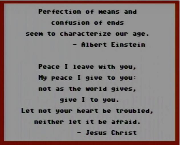 Ce programme de 9 lignes affiche une citation d'Albert Einstein et une de la bible, sur un fond gris avec une bordure rouge.