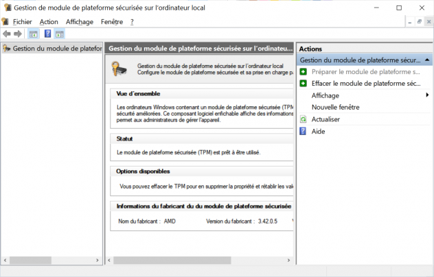 En résumé, la présence d'un TMP 2.0 activé peut-être vue depuis le menu de Windows : Paramètres > Mise à jour et sécurité > Sécurité Windows > Sécurité de l'appareil, ou bien en saisissant la commande tpm.msc dans le terminal.