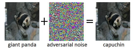 L'image d'un panda à laquelle on ajoute une image de 'bruit', fait que l'intelligence artificielle attaquée va classer l'image non en tant que Panda mais en tant que capucin. (IBM ne précise pas si l'I.A voit alors un religieux ou un signe à longue barbe :-)