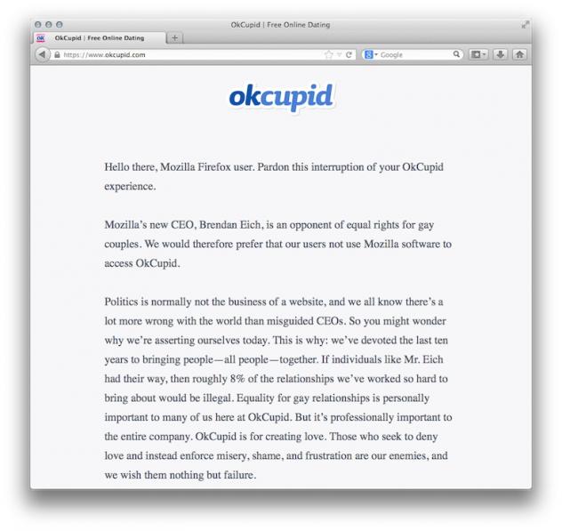 C'est ainsi que le site de rencontres OKCupid se deface lui-même pour présenter aux visiteurs y venant avec Firefox un texte les invitant à utiliser un autre navigateur.