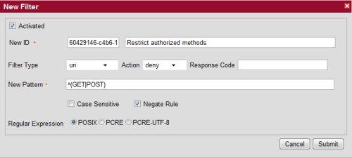 L’équipe du DARC team recommande aux clients utilisant rWeb et sProxy de protéger d’ores et déjà leurs environnements SAP Netweaver en créant une Black List spécifique. La version 4.0 de rWeb et sProxy facilite la création d’un filtre bloquant toutes méthodes autre que les méthodes GET ou POST, comme illustré ci-dessous :