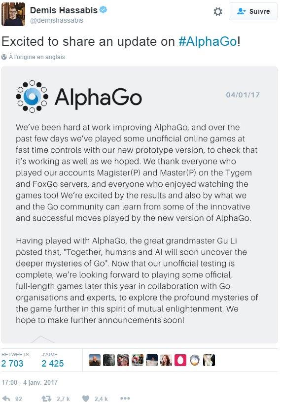 Et dans ce cas, tout le monde ne signifie pas n'importe qui. Par les joueurs défaits par le mystérieux 'Master', se trouvent Sud-Coréen Park Jung-hwan, 3ème joueur mondial et le prodige chinois Ke Jie, 1er joueur mondial.Le mystérieux 'Master' ayant gagné 50 parties d'affilée, des hypothèses ont rapidement surgi pour voir en lui un programme informatique. Peut-être Alpha Go lui-même ? Et c'était bien lui ! Demis Hassabis vient de confirmer dans un tweet.