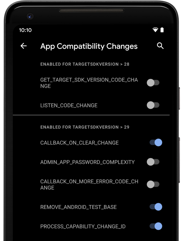 Tout d'abord arrive une nouvelle fonctionnalité baptisée 'App Compatibility'. Dans les options du développeur, Android 11 présente un nouveau sous-menu pour basculer rapidement sur les nouveaux changements de comportement du système par application, sans avoir besoin d'envoyer de commandes shell ADB comme auparavant. Il y a différentes sections pour chaque niveau d'API cible - par exemple, le niveau d'API >29 a son propre ensemble de changements de comportement, le niveau d'API >30 a son propre ensemble de changements, etc.