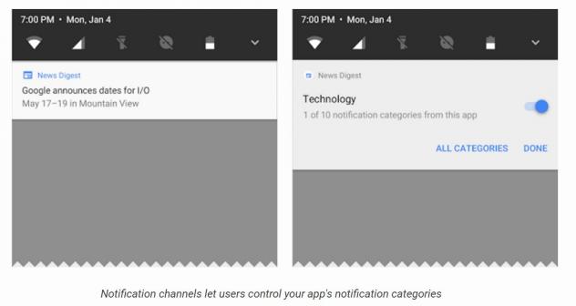 Android 8.0 introduit également les canaux de notifications (Notification channels) Ils s'agit de catégories de notifications, qui permettront aux développeurs de gérer ces dernières avec une granularité plus fine. De son côté, l'utilisateur a la possibilité de modifier le comportement de chaque catégorie individuellement, plutôt que se voir imposer une gestion commune de toutes les notifications.