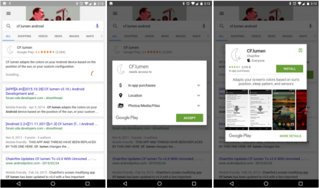 Ainsi Google serait en train d'expérimenter le téléchargement direct d'une application depuis le navigateur Chrome sous Android. L'application à télécharger serait présentée parmi les résultats d'une recherche faite avec le moteur : une petite fenêtre s'ouvrirait, et l'utilisateur n'aurait qu'à donner son consentement pour installer l'application.