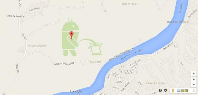 Mais pas perdu pour tout le monde, car il s'y passe de bien étranges choses : le petit robot Android urine sur le logo d'Apple.