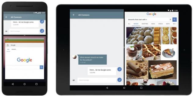 Google emboîte le pas d'Apple : Android N permet de diviser l'écran, sur tablettes et smartphones. Sur les tablettes en mode paysage, la séparation est verticale, avec une application à gauche et une application à droite, tandis que sur smartphone, la séparation est horizontale, avec une application en haut et une application en bas. Bien sûr, pour que cela fonctionne, il faudra que les développeurs mettent en oeuvre cette fonctionnalité dans leurs applications.