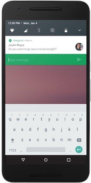 Android N revoie l'ergonomie des notifications. Avec lui, il sera possible de répondre directement à une notification, dans le champ texte qui apparaîtra en dessous.