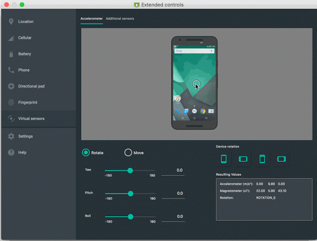 C'est encore des tests facilités avec un émulateur enrichi de contrôles de capteurs virtuels, ce qui permet de d'émuler les signaux de l'accéléromètre, du thermomètre, de magnétomètre, etc.