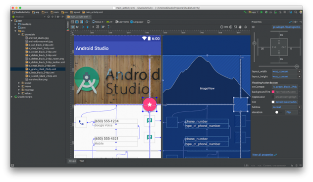 Ainsi, pour faciliter et accélérer la création des interfaces utilisateur des applications Android, l'outil vient avec un nouveau mode de conception graphique. Un Layout Editor permet de sélectionner des composants d'interface pour les déposer dans le concepteur visuel, ou bien dans l'arboresence des composants. Une fois l'interface définie, encore faut-il qu'elle se comporte correctement selon les différentes résolution d'écran. C'est là que vient le Constraint Layout dont le rôle est gérer les contraintes de dimensions et de placement des différents composants, les uns par rapport aux autres.
