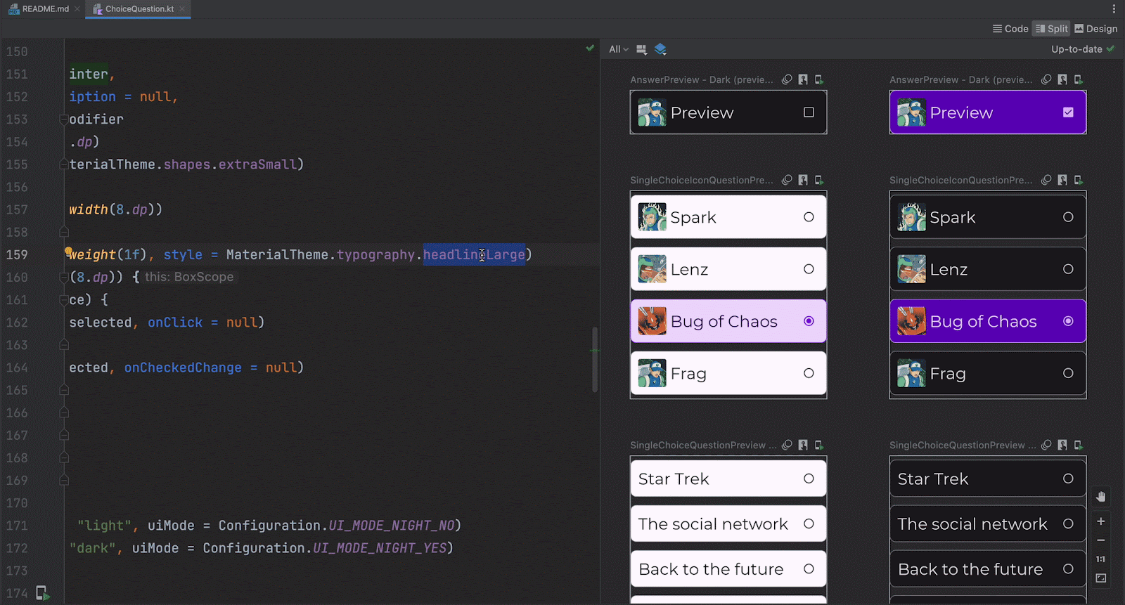 Par exemple, dans les versions antérieures d'Android Studio, vous deviez actualiser manuellement les aperçus de composition après avoir apporté des modifications. Dans Electric Eel, les aperçus se mettent à jour automatiquement après avoir apporté des modifications de code compatibles dans le même fichier, ce qui vous permet d'itérer plus rapidement sur votre interface utilisateur. Si votre changement de code est incompatible, les aperçus afficheront un statut "Needs Rebuild" pour indiquer la nécessité d'une version complète. Lorsque votre code contient des erreurs de compilation lors de l'édition, les aperçus sont temporairement interrompus, puis repris une fois les erreurs corrigées.