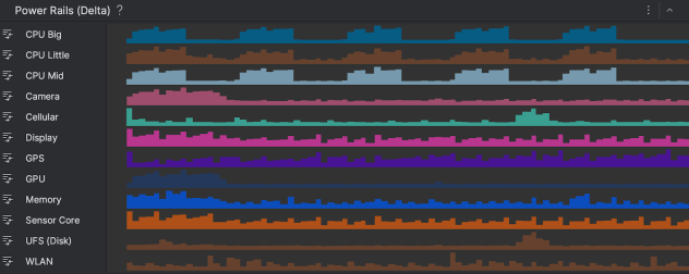 Le nouveau Power Profiler affiche la consommation d'énergie des appareils. Il segmente les informations sur la consommation d'énergie par sous-systèmes appelés « Power Rails ». Cela vous aide à visualiser la corrélation entre l'énergie consommée et les actions se produisant dans votre application. Cette approche consistant à mesurer directement la consommation d'énergie diffère de l'ancien Energy Profiler, qui utilisait uniquement un modèle pour estimer la consommation d'énergie.