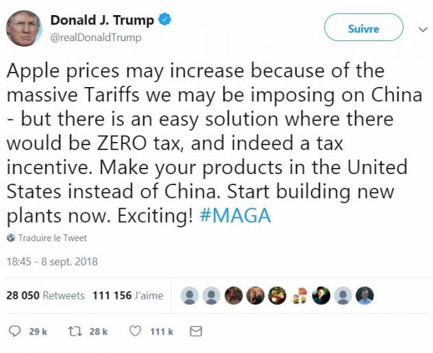 En effet Donald Trump a annoncé de nouvelles taxes à l'import, ce qui inquiète beaucoup Apple qui a contacté la Maison Blanche à ce sujet.