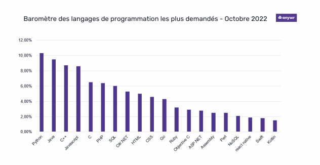 Anywr publie un baromètre des langages informatiques les plus demandés par les entreprises. Ce baromètre basé sur plus de 1000 offres d’emploi dans les métiers IT, montre la concentration en besoins des entreprises sur 6 langages qui regroupent 50% de la demande : Python, Java, C++, Javascrip, C et PHP. Cette demande de la part des entreprises dénote avec le nombre 370 de langages informatiques couramment utilisés dans le monde de l’IT, remarque Anywr.