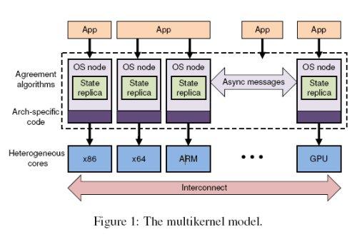 Ainsi Barrelfish est un système à l'architecture novatrice qui se répartit sur chaque des cœurs matériels. Barrelfish étant au final un système d'exploitation multi-noyaus.