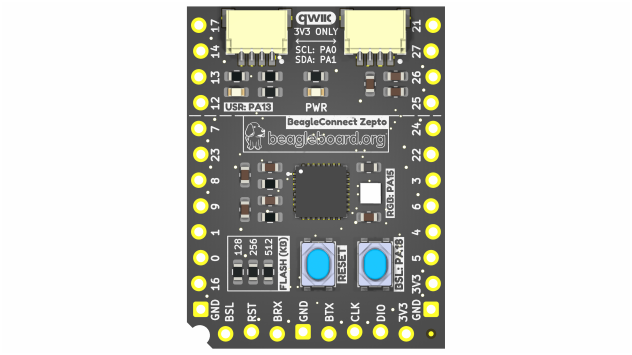 Beagleboard annonce une carte microcontrôleur complète à 1 $ : BeagleConnect Zepto. La carte utilise un MCU peu cher : le MSPMOL1117 de Texas Instruments. Il inclut un Arm Cortex-M0 à 32 MHz intégrant 128 Ko de stockage flash et 16 Ko de RAM. Pour faciliter l'usage de capteurs et créer des PoC, la carte embarque le mikroBUS (headers), un connecteur JTAG et surtout 2 connecteurs Qwiic.