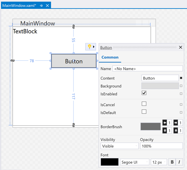 A remarquer encore, de nouvelles fonctionnalités pour vous rendre plus productif en développant des interfaces utilisateur XAML. Vous pouvez désormais modifier très rapidement les propriétés de vos contrôles en utilisant un menu contextuel derrière l'ampoule qui s'affiche pour un contrôle sélectionné.
