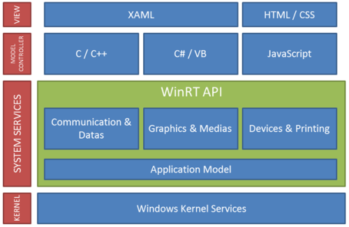 Comme vous pouvez le constater, le choix de la technologie de développement se fera en fonction de vos affinités. Nous pouvons cependant remarquer la présence du couple HTML/JavaScript ainsi que celle de C/C++ / XAML. L’ensemble de la WinRT API (Windows Runtime) étant exposée quel que soit le langage choisi par le développeur et permettant ainsi le dialogue avec le système d’exploitation.