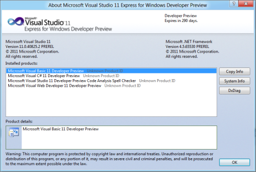 Pour se faire, un « Visual Studio 11 Express for Windows Developer Preview » est mis à disposition et permet notamment de remarquer que la version du Framework sur lequel tout se repose est la 4.5 !