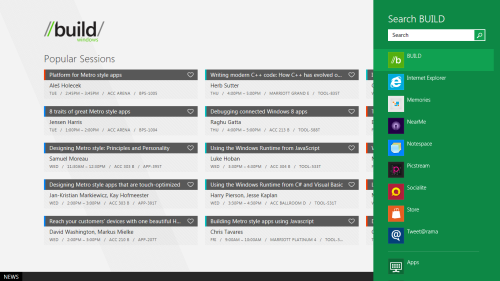 Sans pour autant faire disparaître le « Desktop » bien connu de ses utilisateurs, les applications de type « Metro » se veulent fluides et dynamiques. La différence vis-à-vis de la concurrence se faisant notamment par l’ajout de « Charms » disponibles dans l’ensemble des applications « Metro » et permettant la mise à disposition de contrats de services. Pour exemple, le « Search » permettant ainsi de chercher aussi bien sur le système de fichier, que sur internet ou encore dans une application.