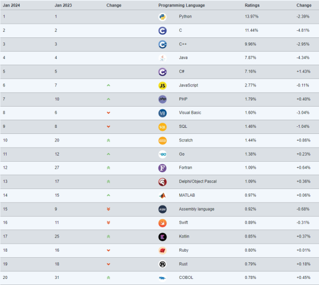 A remarquer encore, Fortran et Kotlin sont devenus des membres permanents du top 20, remplaçant les anciens favoris R et Perl. La présence de Fortran a de quoi surprendre. Fortran est très apte à analyser des chiffres avec de bonnes bibliothèques et reste un favori universitaire dans de nombreux domaines, écrit TIOBE. Fortran, classé 12ème devant Delphi ou Swift par exemple, a connu une hausse de popularité de 0.64% au cours de 2023. Comme quoi il est possible d'être encore plus dinosaure que C :-)