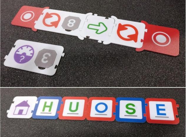 Enfin, ce robot pourra aussi apprendre à l’enfant à écrire comme l’illustre la pièce “maison” de la dernière image. En posant le robot sur cette pièce il avancera sur les pièces suivantes afin de vérifier que le mot “house” est écrit correctement. Si l’enfant a fait une faute, le robot s’y arrêtera et affichera une lumière rouge afin de lui montrer où il s’est trompé.