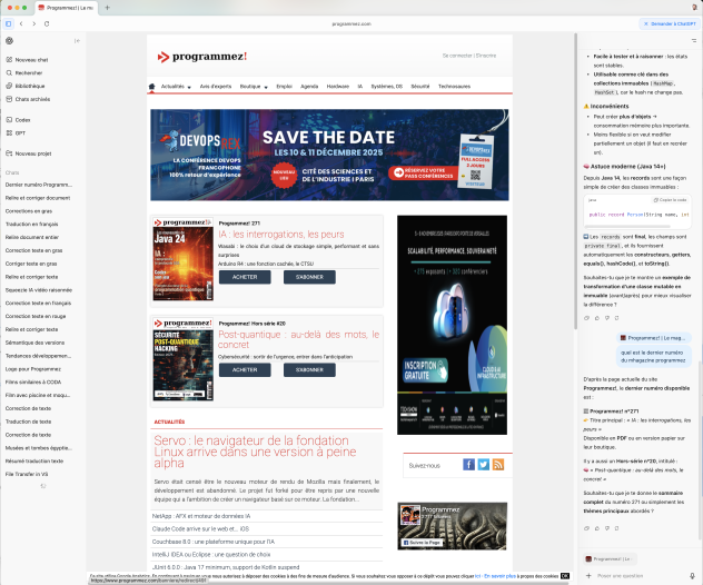 Pour utiliser le navigateur, il faut se connectetr à ChatGPT. Au 1er démarrage, vous pouvez importer les mots de passe, favoris, etc. provenant de Safari ou de Chrome. L'interface est plutôt sobre. La bouton demandez à ChatGPT affiche le panneau dédié sur la droite. On peut poser nos questions ou poser des questions par rapport au site affiché. Sur la gauche, nous pouvons avoir un volet ChatGPT avec l'accès à différentes fonctions (recherche, proposition de chat).