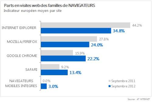 - De plus en plus menacé par Google Chrome, la part de visites moyenne de Mozilla en Europe passe de 27,8% en septembre 2011 à 24% en septembre 2012.