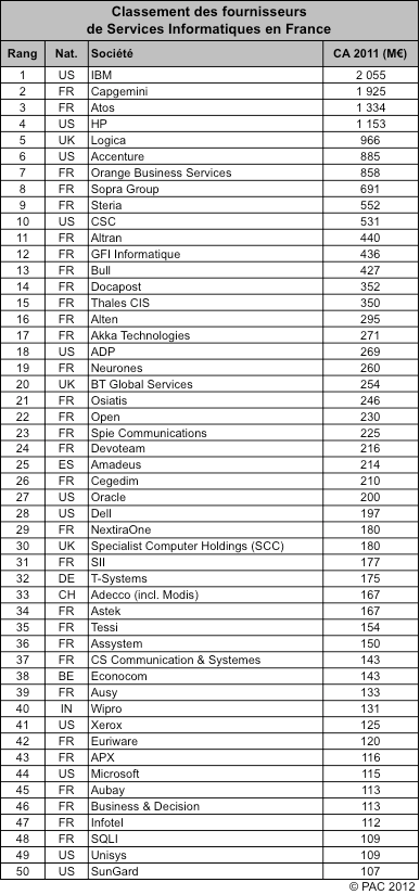 Pierre Audoin Consultants (PAC) présente son top 50 des prestataires de services IT en France. Le classement connait peu de changements majeurs, traduisant un certain attentisme dans les projets de consolidation sur le secteur des SSII en France.