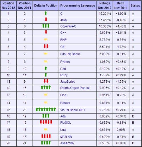 Avec toutes les réserves qui s'imposent avec l'index TIOBE, car celui-ci est basé sur le recherches faites dans les principaux moteurs de recherche, Objective-C est toujours le langage qui monte, au point de gagner la troisième place dans le classement de novembre.