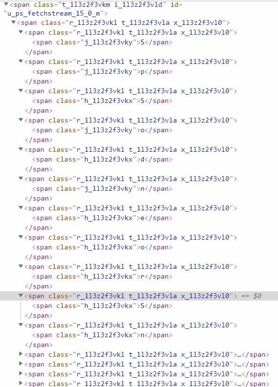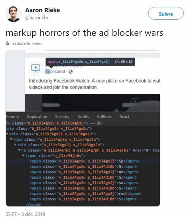 Sur cette capture, on voit bien l'ajout de div inutiles, d'un nombre de classes énorme, une trentaine, pour enfumer les bloqueurs de publicités qui rechercheraient le mot 'Sponsored'. Ce mot lui-même est obfusqué avec 9 balises span. Les balises ajoutent les lettres au mot pour leurrer les bloqueurs, tandis que les classes rendent ces décorations invisibles à l'utilisateur humain.