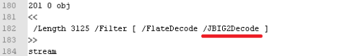 La définition de l’objet stream référencé à partir du tableau XFA montre que celui-ci ne comporte pas les données d’une image et qu’il pèse 3 125 octets. Deux filtres - FlateDecode et JBIG2Decode - doivent être utilisés pour décoder les données d'origine.