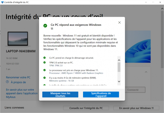 Cet outil de test, dans sa version définitive, permet de comprendre clairement pourquoi une machine n'est pas compatible avec Windows 11. Notamment, vous saurez facilement si votre machine dispose du fameux processeur cryptographique TPM 2.0 requis. Sous réserve que celui-ci soit activé dans BIOS / UEFI.