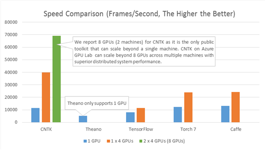 Bien entendu, benchmark de Microsoft à l'appui, CNTK écrabouille la concurrence en ce qui concerne les performances : Theano, Torch 7, Caffe et bien sûr TensorFlow :-)