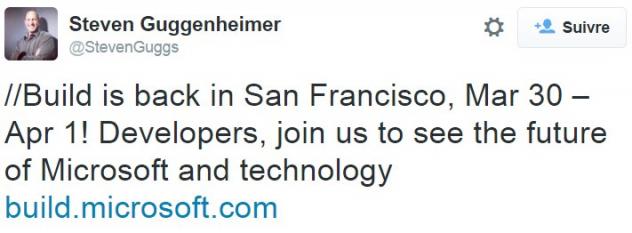 Les dates de la Build 2016 désormais connues , tweetées par Steven Guggenheimer. Microsoft vous invite à rejoindre le futur de Microsoft et de la technologie du 30 mars au 1 avril 2016 à San Francisco.