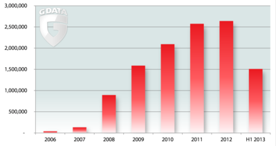 Durant la première moitié de l’année 2013, 1 509 934 nouvelles souches de codes malveillants sont apparues, soit en moyenne 8342 par jour. Cela représente une hausse de près de 20 % par rapport au deuxième semestre 2012.