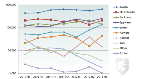 Dans son rapport de sécurité, le G Data SecurityLabs fait un état des lieux des risques apparus durant le 1er semestre 2013. L’éditeur de logiciel de sécurité allemand constate que la croissance du nombre de nouveaux codes repart à la hausse après une relative accalmie en 2012. Les chevaux de Troie restent les codes préférés des cybercriminels. Dans cette famille, la part des chevaux de Troie bancaires a diminué. Des actions réalisées dans différents pays par les autorités ont permis de mettre fin à certains réseaux de commandes de ces codes spécialisés dans le vol d’argent. Pour contrer cela, les concepteurs de botnet développent de nouveaux systèmes de contrôle décentralisés.