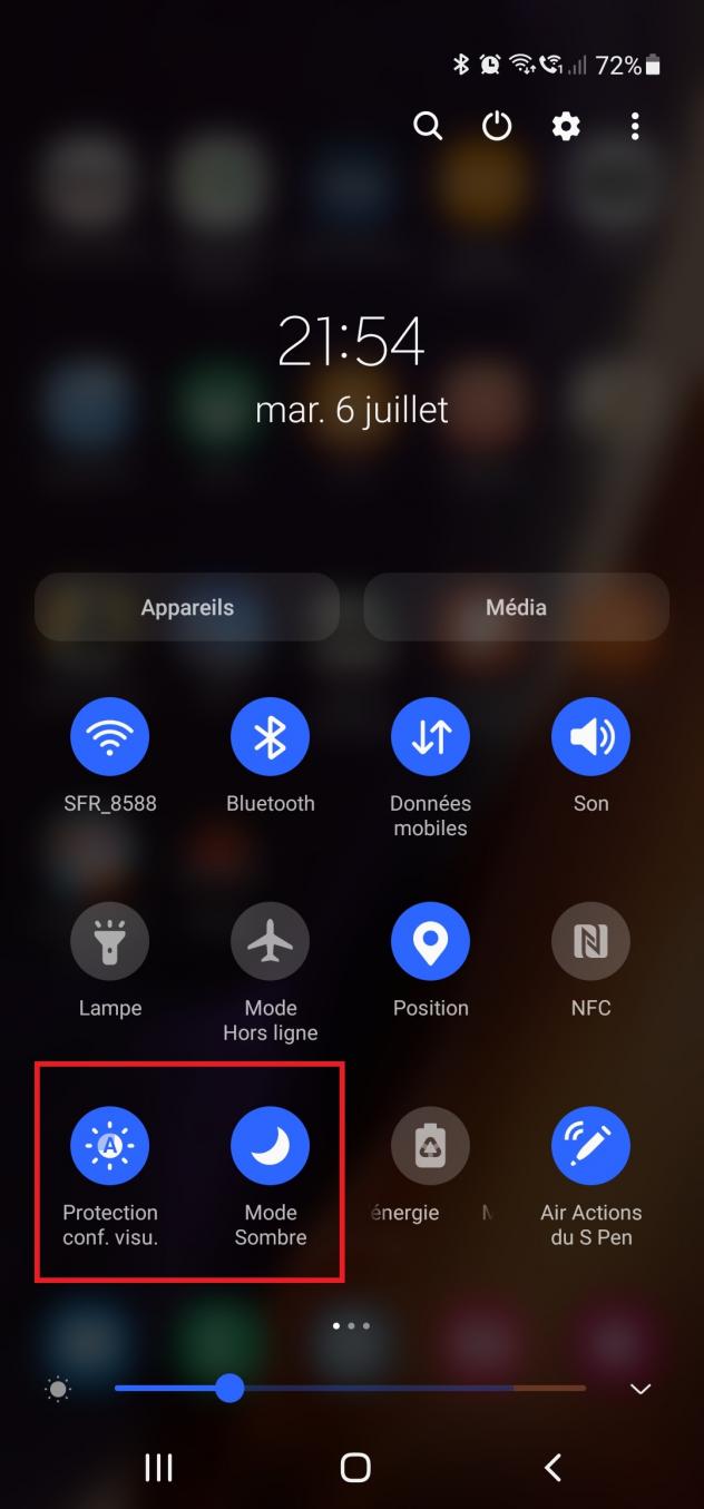 Tout simplement pour gagner en confort visuel. Attention, le dark mode ne doit pas être confondu avec le mode qui atténue la quantité de lumière bleue qui s’appelle Protection confort visuel, Éclairage nocturne ou Mode nocturne selon les surcouches.
