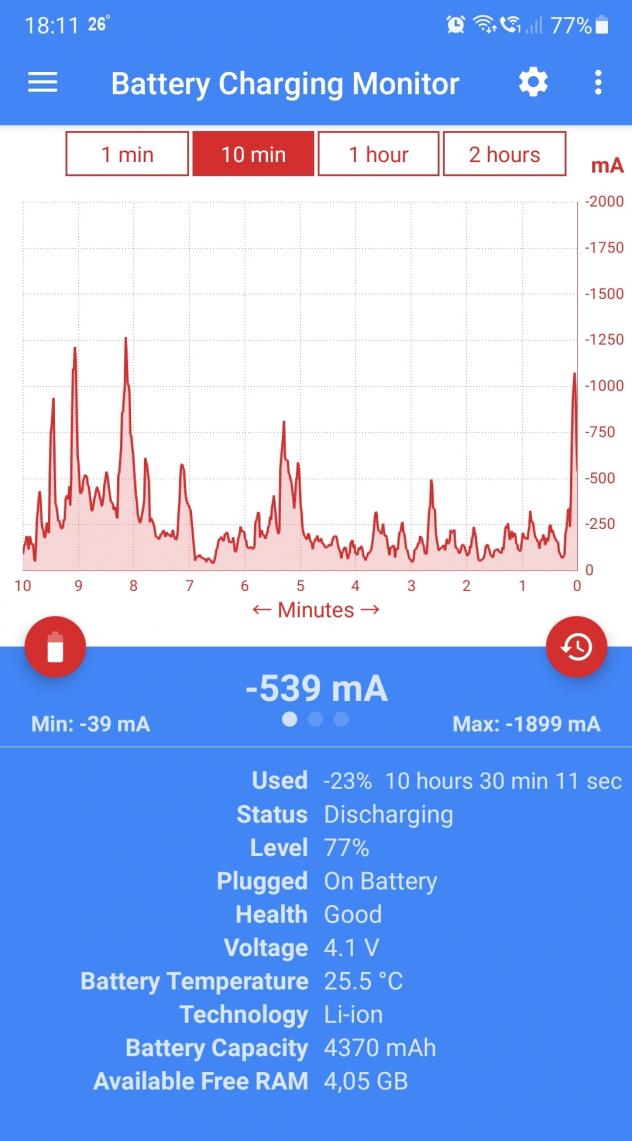 Avec l’application Battery Charging Monitor qui permet de répertorier la consommation minimale et maximale sur une période donnée, nous avons fait une petite expérience. Nous avons laissé tourner l’app pendant 3 jours en mode sombre et 3 jours en mode « normal ». Dans ce dernier, la consommation minimale est de 39 mA et la maximale de 1899 mA tandis qu’en mode sombre, les chiffres donnent 26 mA et 1149 mA. Si la consommation minimale est peu parlante, car elle est sans doute enregistrée avec l’écran éteint, en passant au mode sombre, la baisse de consommation est donc de 39,5 %.