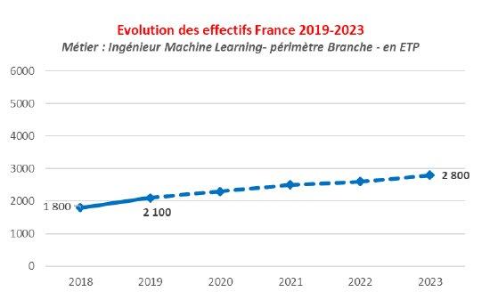 Les populations d’Ingénieurs Machine Learning devraient croître à un rythme constant, avec un élargissement plus systématique à des technologies matures (notamment Vision Artificielle et Traitement du Langage Naturel, aujourd’hui souvent spécialisées)