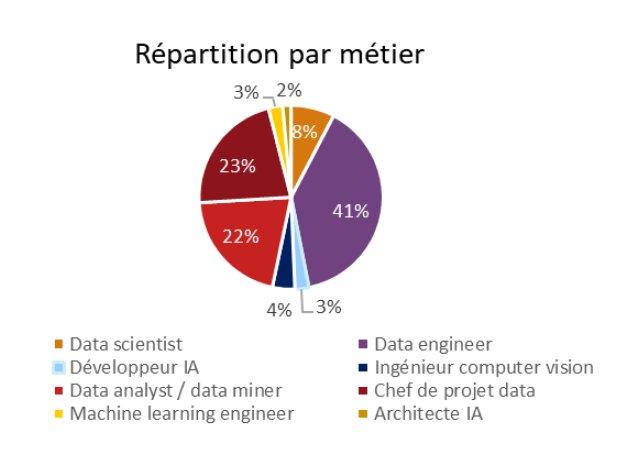 Les profils de Data engineer sont les plus recherchés (41% des offres), suivis par les Chefs de projet data (23%) et les Data analysts/data miners (22%).