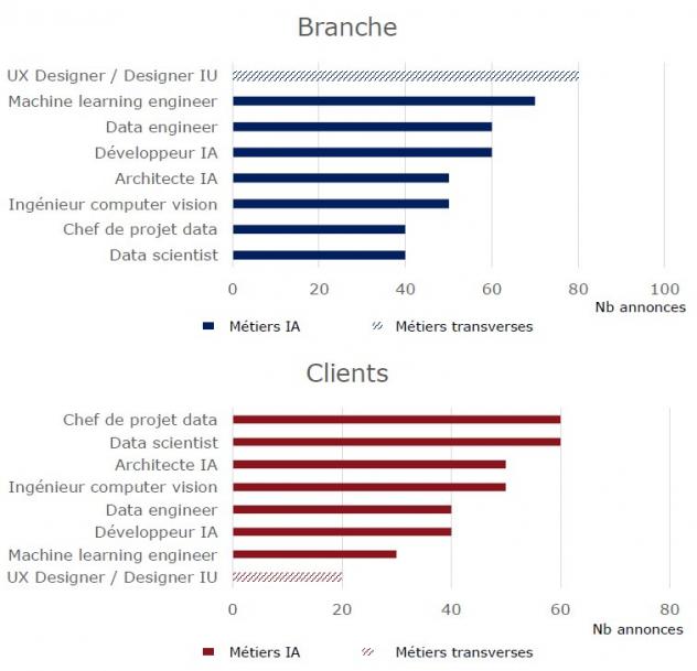 Les offres d’emplois IA proviennent à 54% d’acteurs de la Branche et à 46% de clients. Les offres d’emplois transverses proviennent, elles, majoritairement d’acteurs de la Branche (85%)