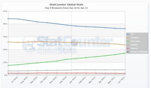 Incontestablement, le navigateur Google Chrome fait fort en ce moment, en ce qui concerne la conquête de parts de marché. D'après les statistiques StatCounter, en juin 2010, le navigateur de Mountain View détenait moins de 10% des parts de marché, 9.24% exactement. Or, toujours d'après StatCounter, Chrome, en juin 2011 a passé la barre des 20%, avec 20.65% de parts de marché ce qui représente une très belle progression.