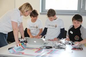 Le 22 mars dernier a eu lieu la première édition de Devoxx4Kids Lille, une journée qui a été un succès. L’événement à démarré le matin par les préparatifs des locaux et la mise en place des ateliers. Le RDV était donné aux organisateurs à 10h pour commencer à installer et tester le matériel qui allait être utilisé. Mise en place des panneaux de signalisation, organisations des salles, test du réseau, configuration des robots NAOs, test de la machine à café à plusieurs reprise, installation de l’accueil, montage des Mindstorms par les grands enfants, récupération des courses, distribution des tshirts…